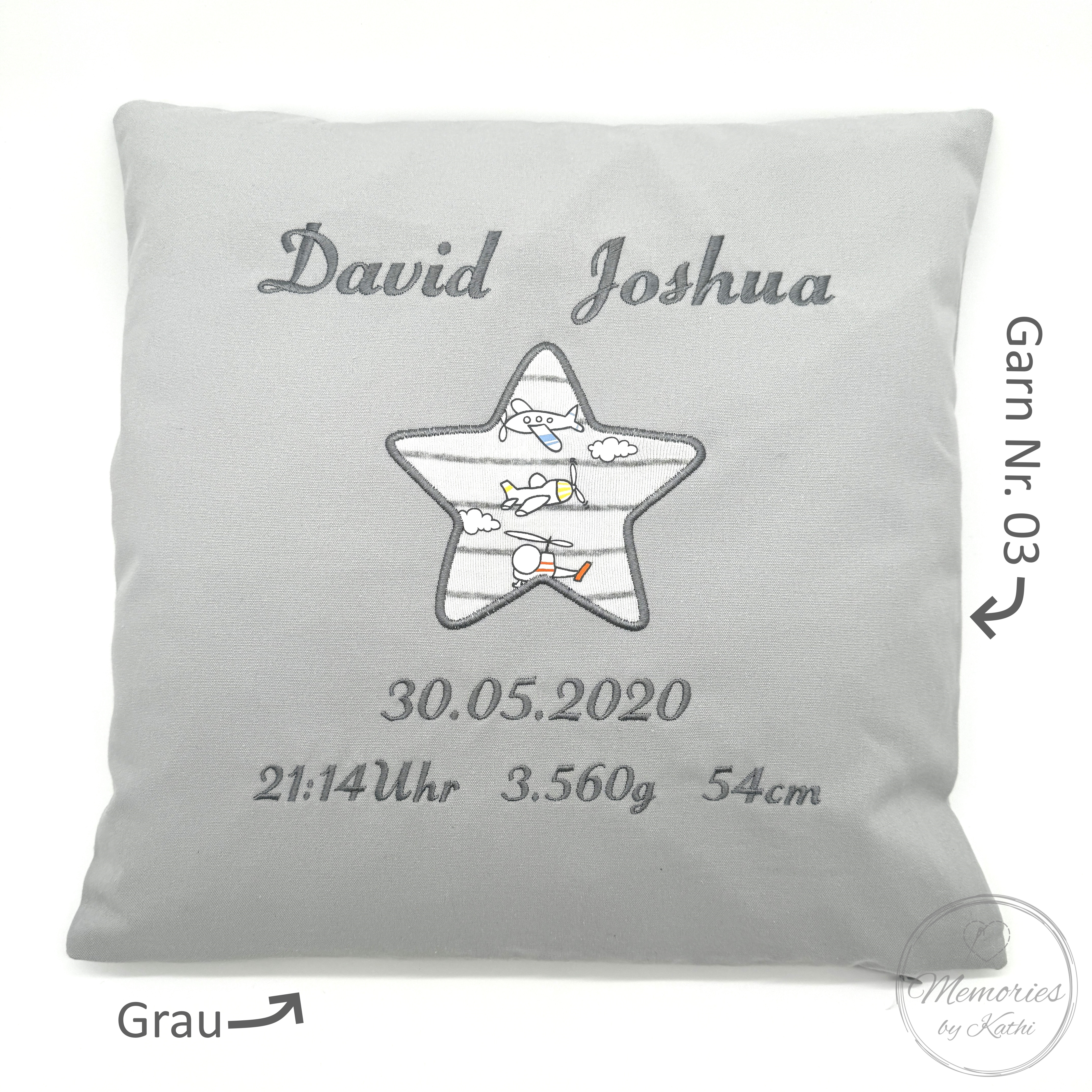 Wähle aus zwei Applikationen – einem süßen Herz oder einem verspielten Stern – und verewige ein Stück der Kleidung deines Babys auf diesem Kissen. Um das Design perfekt zu gestalten, kannst du die Garnfarbe für die Applikation und den Text ganz nach deinen Wünschen auswählen. Sieh dir einfach die Garnfarbenübersicht an, um deinen Favoriten zu finden.