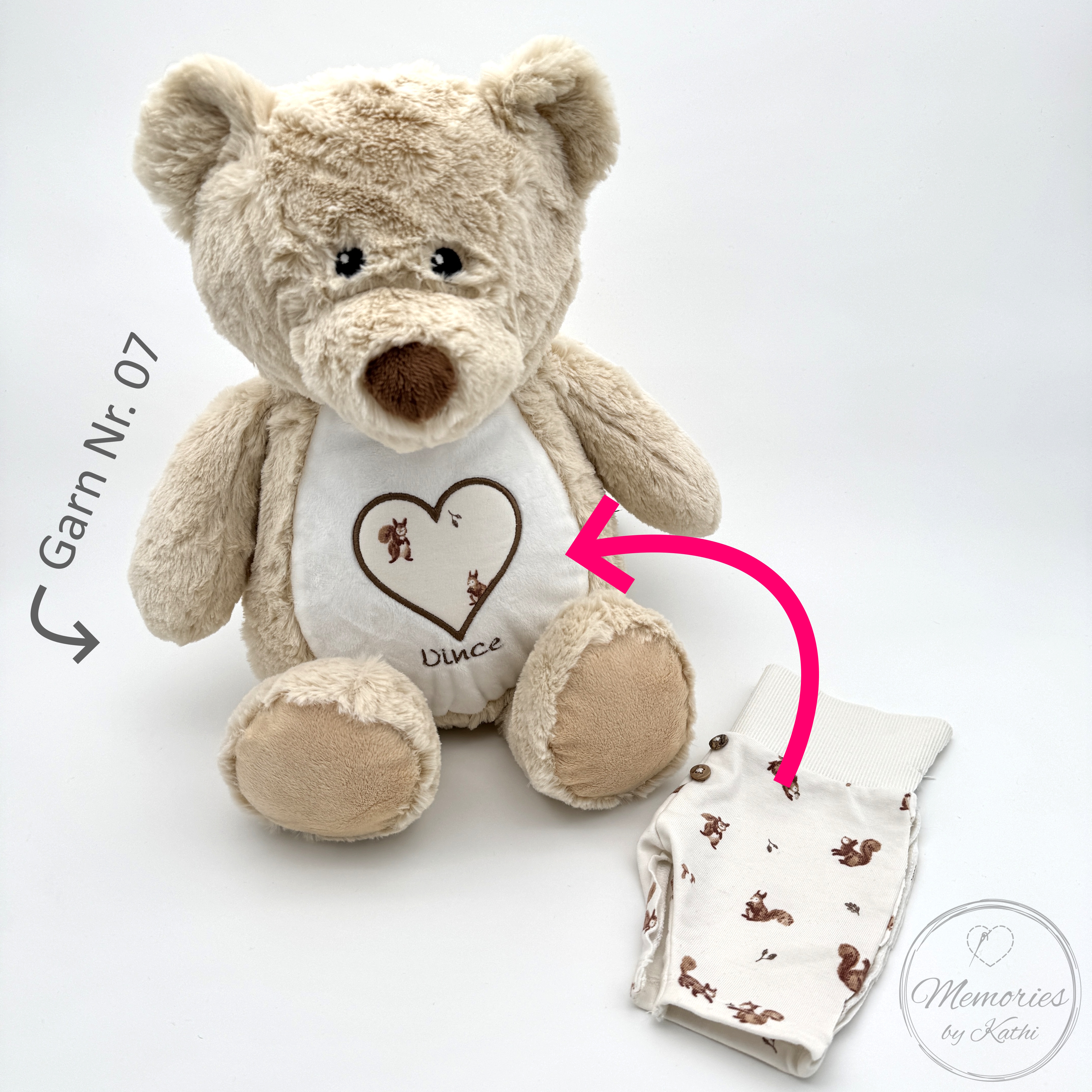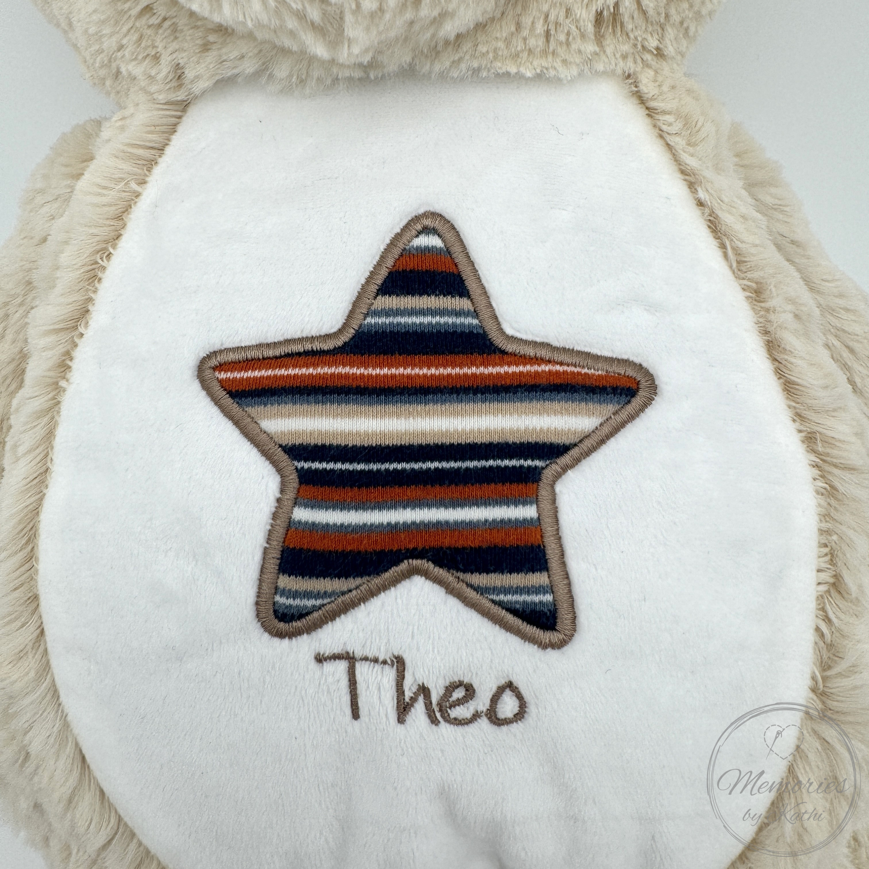 Durch eine Applikation aus einem Stoffstück deiner Wahl wird es zu einem ganz persönlichen Erinnerungsstück. Vielleicht ein kleines Stück aus dem ersten Strampler oder der liebsten Babydecke?