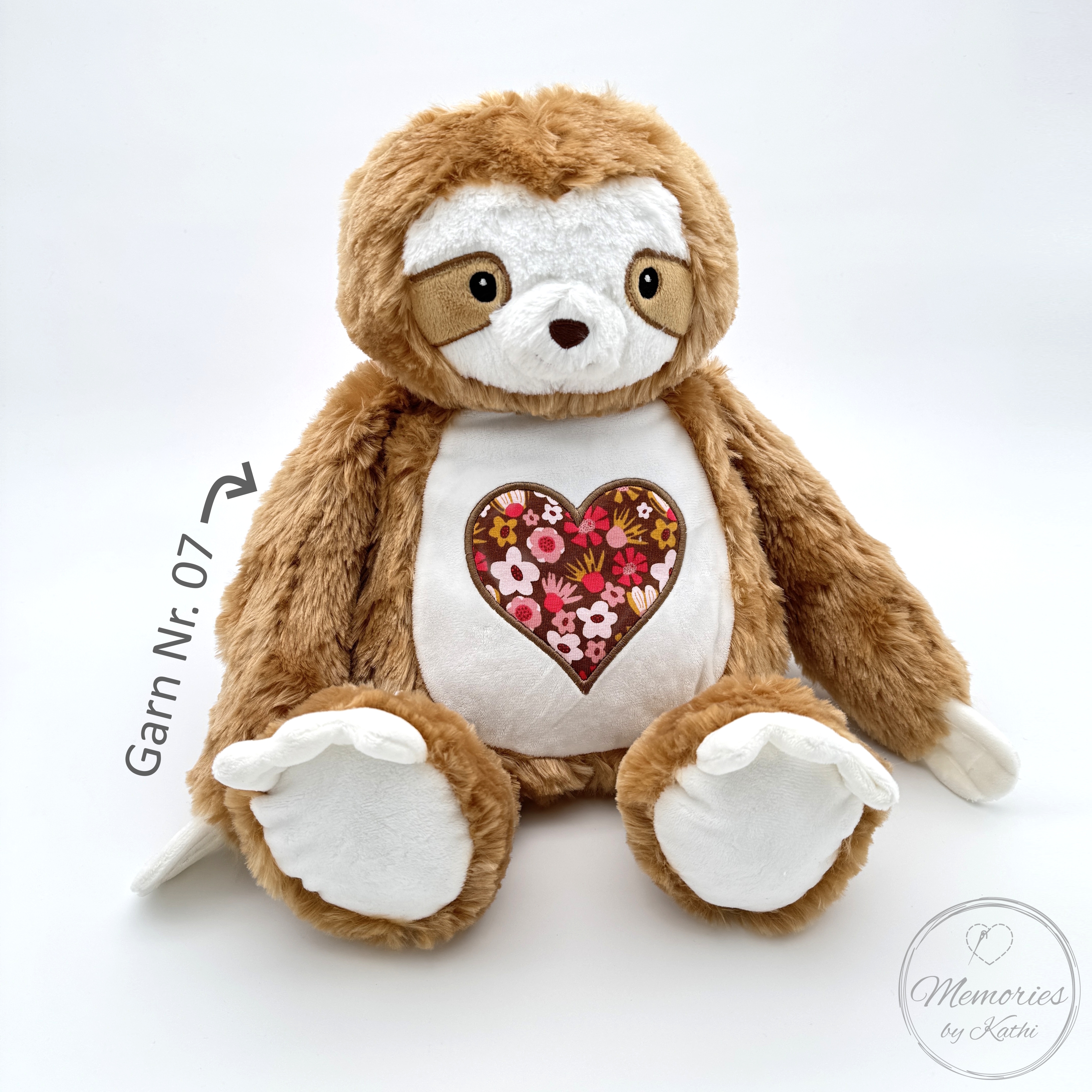 Dieses süße Faultier ist nicht nur ein Kuscheltier, sondern ein ganz besonderes Erinnerungsstück. Durch eine Applikation aus einem Stoffstück eines besonders lieb gewonnenen Kleidungsstücks wird es zu einem wertvollen Andenken an die kostbaren Baby- und Kindheitsmomente.